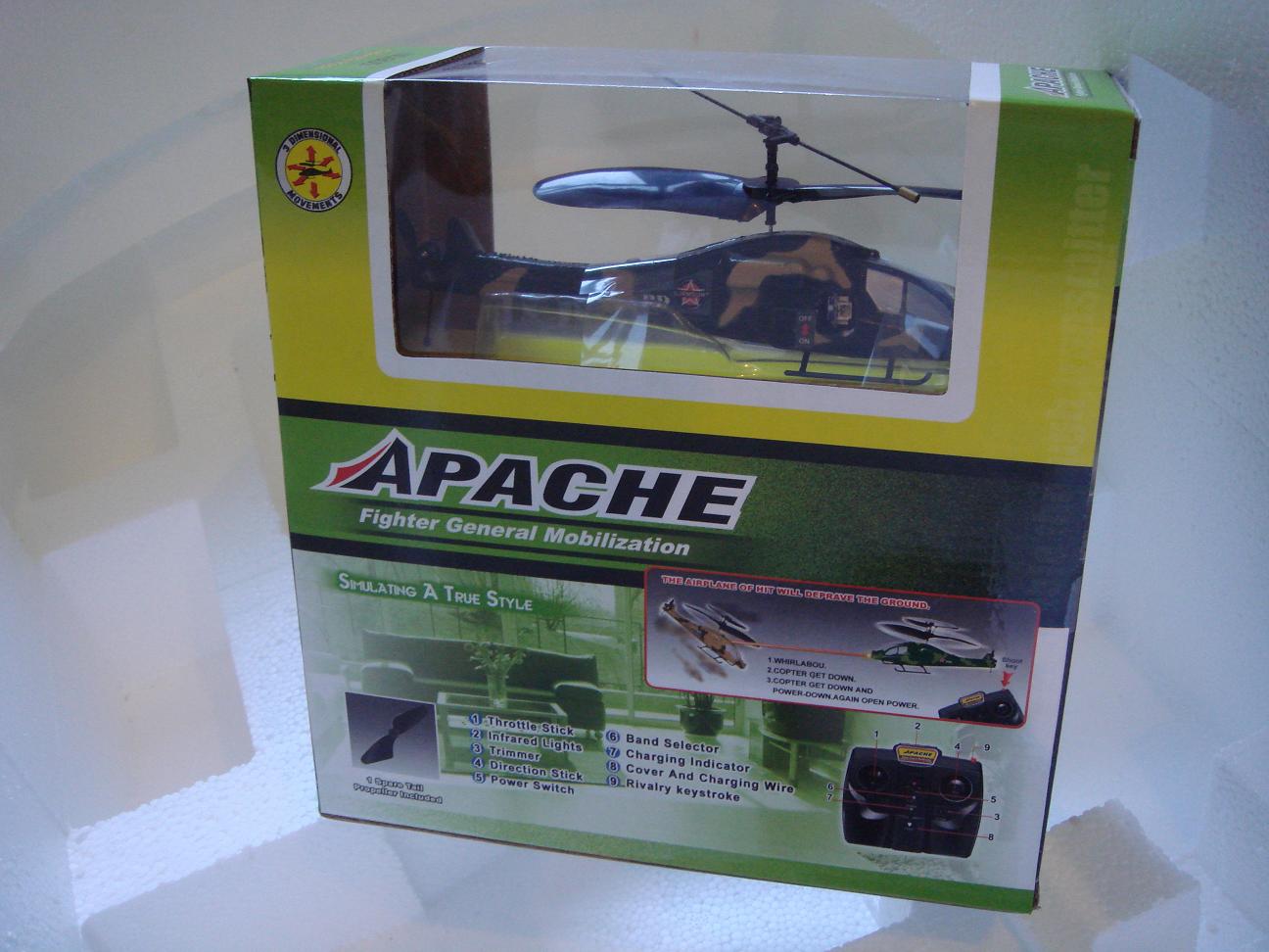 Mini Mohawk Main rotor diameter is 130mm (5.25-inch) Length: 170mm (6.5-inch) excluding rotors Rear rotor diameter is 30mm (1.25-inch) Product weight: only 10g, including flight battery Rechargeable flight battery: high-capacity integral lithium-polymer battery Charger: integral transmitter/charger supplied with LED indicator/auto shut-off Simply plug-in and charge Easy to use connections Charging time: 6 to 8 minutes for full charge Flight duration: 10 minutes or more between charges Packing Size: 66*39*69 CM Certificate: CE/ROHS Batteries required: 6 x 1.5V AA alkaline batteries for transmitter/charger