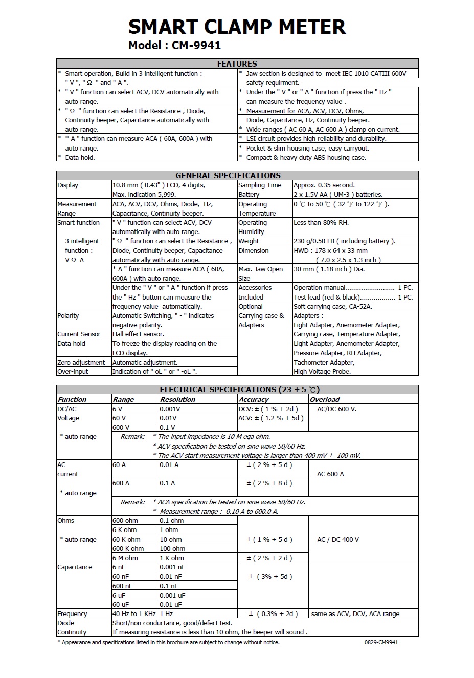 – Measurement Functions: ACA, ACV, DCV, Ohms, Diode, Capacitance, Frequency, Continuity beeper