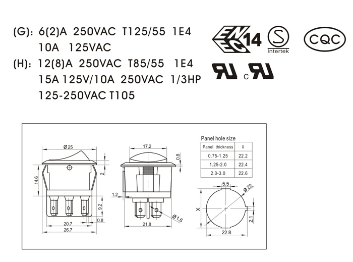(G): 6(2)A 250VAC T125/55 1E4