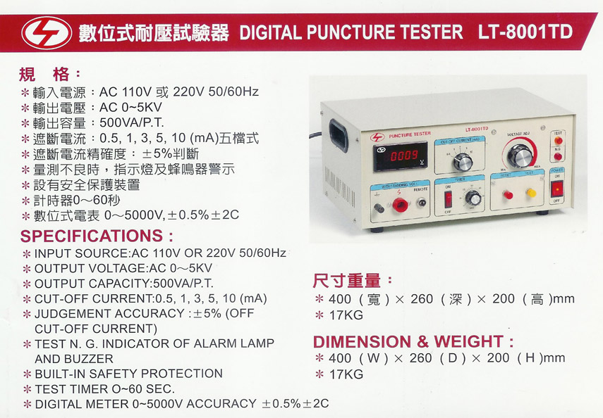 Product Name : | Puncture Tester 數位式耐壓試驗器 - LT-8001TD |