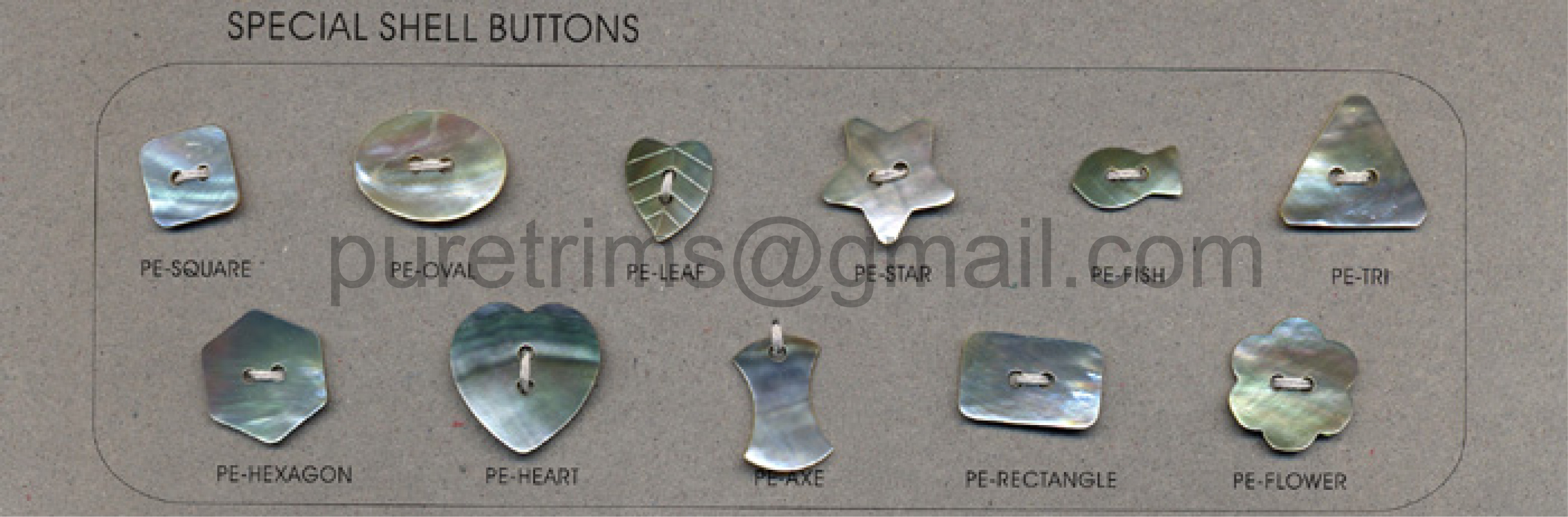 We specialize in making shell buttons, such as Mother of Pearl, Trocas, Agoya, Rivershell, Abalone and etc. Can be DTM.